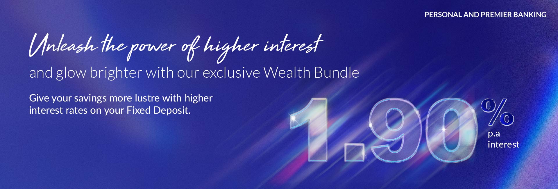 Enjoy 1.90% p.a. on your 3-month, 6-month, and 12-month SGD Fixed Deposit (FD) with any eligible wealth product sign-up. If you opt in as an Accredited Investor (AI) during the promotion period with us, you can place a 3-month FD at the promotional rate with no product sign-up!